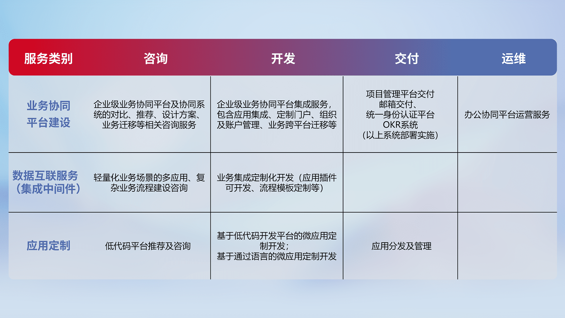 针对钉钉、、企微、、、、IDaas等平台级产品提供产品的规划、、、、方案、、、、交付、、定制化开发等服务,,,实现如统一协同办公、、智能客户服务、、、混合会议管理、、、、智能数据查询、、、、等业务场景,,,,实现数字化转型。。。。